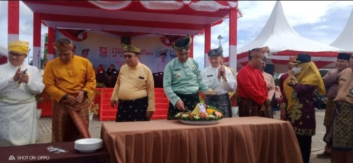 Bupati Natuna, Wan Siswandi, didampingi Wabup Natuna, Rodhial Huda, saat memotong nasi tumpeng HUT Natuna ke-23.