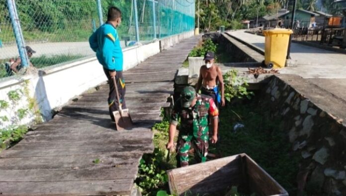Babinsa Koramil 02/Tarempa, Kopda Hasimsyah Sarkawi, saat melakukan gotong royong bersih lingkungan, bersama masyarakat Desa Temburun.