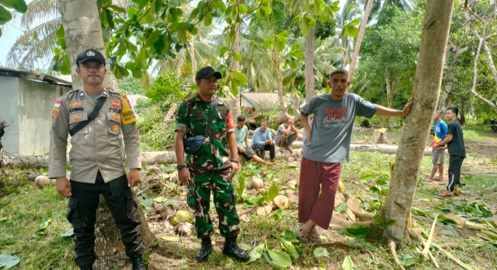 Setelah itu, anggota Babinsa dan Bhabinkamtibmas, bersama sejumlah warga setempat, langsung melakukan gotong-royong untuk mengevakuasi pohon kelapa yang menimpa kediaman Mupridin, dan juga sebuah gubuk yang ada disamping rumah tersebut.