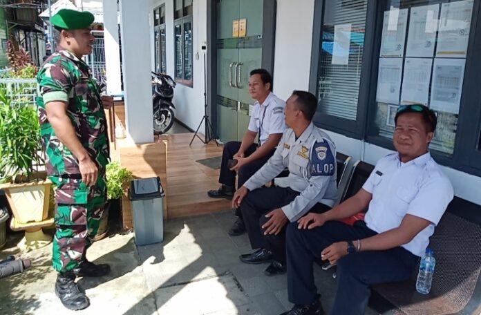 Babinsa Serda M. Idris anggota Babinsa Koramil 02/Tarempa Kodim 0318/Natuna, saat menjalin koordinasi dengan petugas Syahbandar.