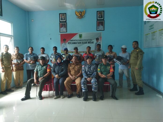 Natuna, SinarPerbatasan.com – Personil Koramil 05/Midai Kodim 0318/Natuna, Sertu Y. Harefa dan Kopda Sopan Supian, turut menghadiri undangan penyerahan seragam anggota satuan Perlindungan Masyarakat (Linmas) di Kecamatan Midai dan Suak Midai, pada Senin (22/01/2024) siang.