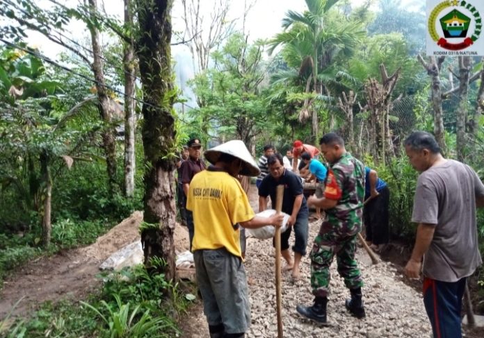 Goro dilakukan Babinsa untuk memperbaiki jalan yang tergenang air hujan dan berlumpur di Desa Sebelat, Kecamatan Midai, Kabupaten Natuna.