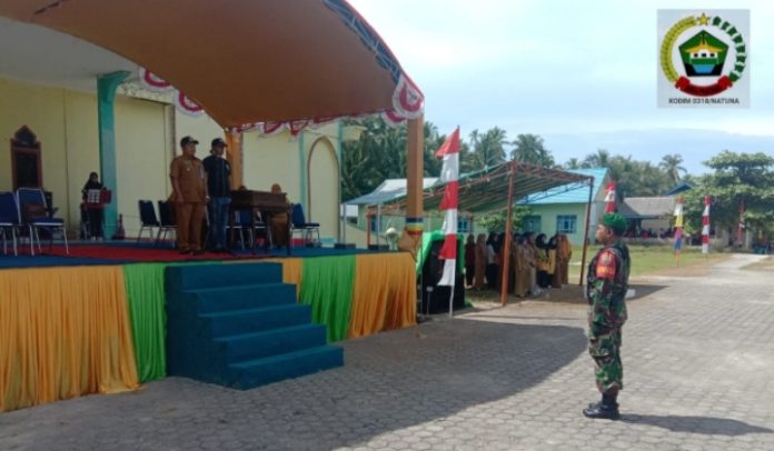 Babinsa Koramil 05/Midai Kodim 0318/Natuna, saat mengikuti gladi bersih upacara HUT RI ke-77 tahun 2022 di Kecamatan Midai.