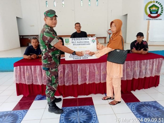 Babinsa Koramil 0t/Midai, Kopda Alimin Pagan, ikut menyerahkan bantuan BLT-DD secara simbolis di Desa Sebelat, Jum’at (15/03/2024) pagi.