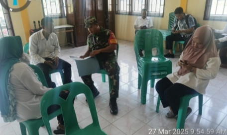 Babinsa Koramil 08/Pulau Laut, Pratu Suprianto Sitorus, saat menjalin komsos dengan staf kantor Desa Tanjung Pala, Kamis (27/03/2025) siang.