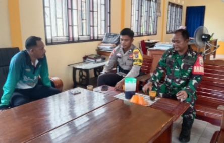 Terlihat Babinsa Koramil 08/Pulau Laut, Serda Zulkarnaini, saat melaksanakan komsos dengan Bhabinkamtibmas dan Staf Kantor Desa Tanjung Pala, Rabu (16/10/2024) siang.