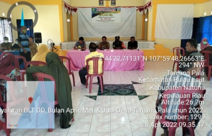 Natuna, SinarPerbatasan.com – Babinsa Desa Tanjungpala, Koramil 08/Pulau Laut, Kodim 0318/Natuna, Serda Zulkarnaini, turut menghadiri acara pembagian Bantuan Langsung Tunai Dana Desa (BLT-DD) tahun anggaran 2022.