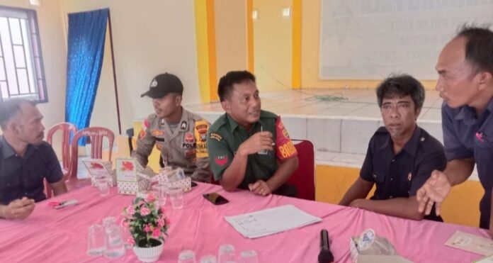Tampak Babinsa Koramil 08/Pulau Laut, Koptu Sittong M Purba, dan Bhabinkamtibmas Polsek Pulau Laut, saat memberikan himbauan cuaca ekstrem kepada warga Desa Kadur, Kecamatan Pulau Laut, Rabu (25/01/2023) pagi. (foto : Udin)