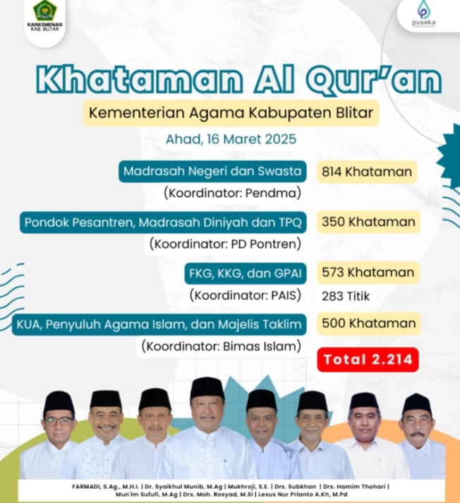 Tak ketinggalan, Kantor Urusan Agama (KUA), Penyuluh Agama Islam, dan Majelis Taklim turut berpartisipasi dengan menyumbangkan 500 kali khataman. Antusiasme masyarakat Blitar dalam kegiatan ini menunjukkan semangat kebersamaan dan kecintaan terhadap Al-Qur’an yang begitu tinggi.