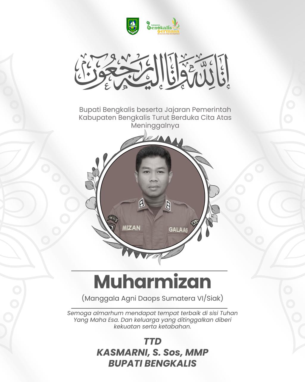 Bengkalis, SinarPerbatasan.com – Bupati Bengkalis Kasmarni menyampaikan duka cita yang mendalam atas wafatnya salah satu pejuang kebakaran hutan dan lahan (karhutla), almarhum Muharmizan, yang gugur saat menjalankan tugas pemadaman karhutla di wilayah Kabupaten Bengkalis.