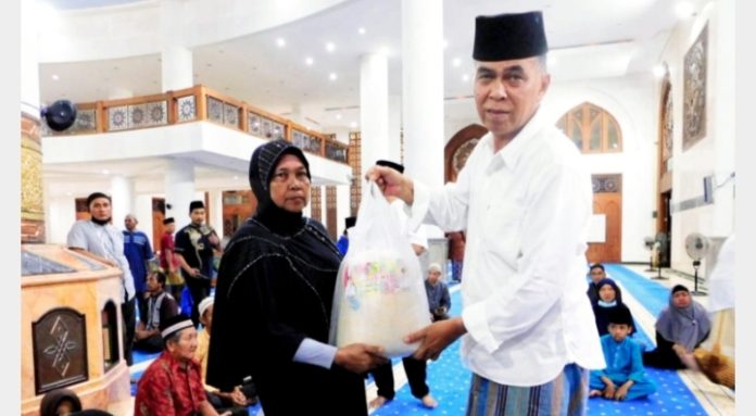 Bupati Natuna Wan Siswandi, saat menyalurkan Infak Beras dari ASN untuk Masyarakat Natuna.