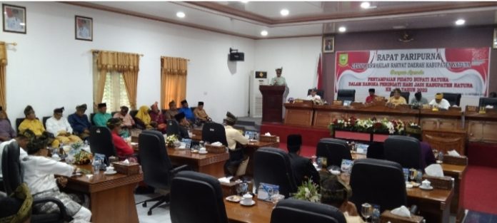 Bupati Natuna Wan Siswandi, saat menyampaikan pidato dalam rangka HUT Kabupaten Natuna ke-23 tahun, melalui rapat paripurna di Kantor DPRD Natuna.