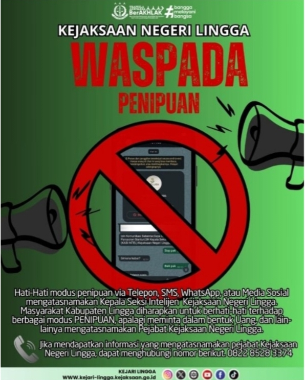 “Apabila masyarakat menerima telepon, pesan WhatsApp, atau komunikasi lainnya yang mencurigakan dan mengatasnamakan pejabat Kejaksaan, segera lakukan konfirmasi ke kantor Kejaksaan Negeri Lingga atau melalui nomor resmi yang tersedia. Jangan langsung percaya, apalagi sampai mentransfer uang,” ujarnya.