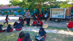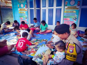 Selain menemani anak-anak membaca buku, Ipda Mudiyanto juga selalu memberikan pesan literasi dan bahayanya kenakalan remaja di jaman moderenisasi.