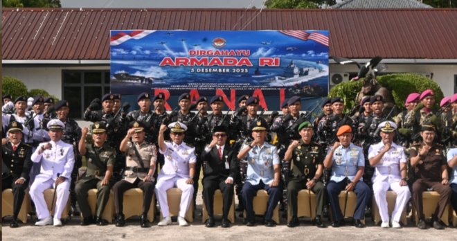 Natuna, SinarPerbatasan.com – Komandan Lanud Raden Sadjad (RSA) Natuna, Marsekal Pertama TNI Onesmus Gede Rai Aryadi, S.E., M.M., M.Han diwakili Kepala Dinas Teritorial Lanud RSA Kolonel Adm Marshall, M.Si., menghadiri Upacara Peringatan Armada RI 2025 di Mako Lanal Ranai, Kabupaten Natuna, Kepulauan Riau, Jumat (5/12/2025).
