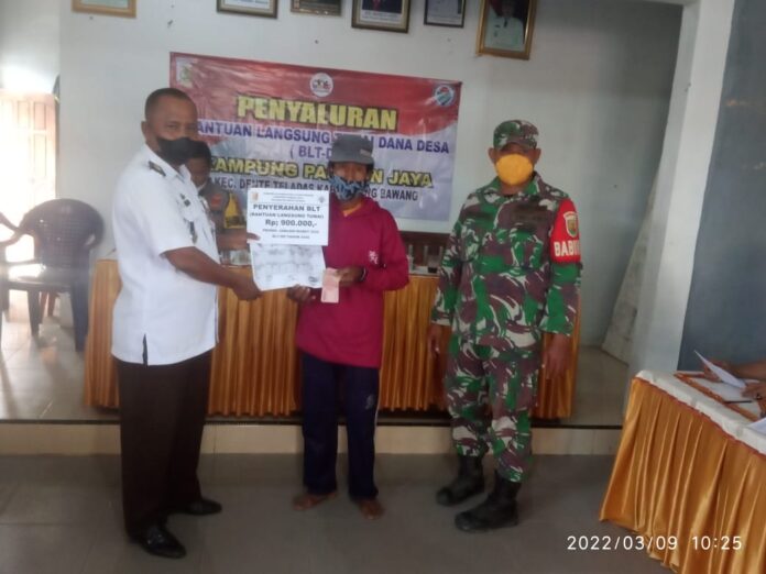 Tulang Bawang, SinarPerbatasan.com – PLT Kepala Kampung Pasiran jaya, Kecamatan Dente Teladas Kabupaten Tulang Bawang, Suratman salurkan Bantuan Langsung Tunai berupa (BLT) dari Dana Desa Tahap Pertama pada tahun 2022, ., Rabu 9 Maret 2022.