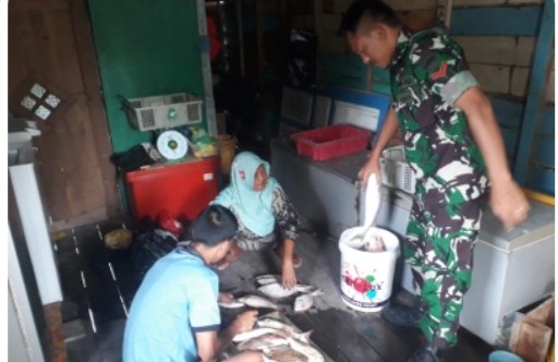 Babinsa Koramil 08/Pulau Laut, Koptu Sittong Purba, saat melakukan komsos dengan pengepul ikan di Kecamatan Pulau Laut, Selasa (03/09/2024) siang.