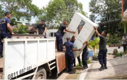 Tampak sejumlah petugas BP Batam, saat membantu mengangkut barang-barang warga terdampak pengembangan Rempang Eco-City, Senin (24/06/2024) siang.
