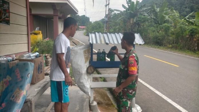 Serda Agung Joko, anggota Koramil 02/Tarempa Kodim 0318/Natuna, saat melaksanakan komsos dengan penjual BBM eceran.