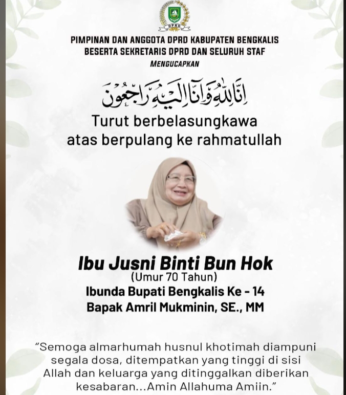 Bengkalis, SinarPerbatasan.com – Pimpinan dan Anggota DPRD Bengkalis beserta Sekretaris dan seluruh staf mengucapkan bela sungkawa sedalam-dalamnya atas meninggalnya Mertua Bupati Bengkalis Kasmarni yang merupakan Ibunda tercinta dari Bupati Bengkalis ke-14, Bapak Amril Mukminin dan Al Azmi Ketua Komisi II DPRD Bengkalis, Rabu (15/01/2025).