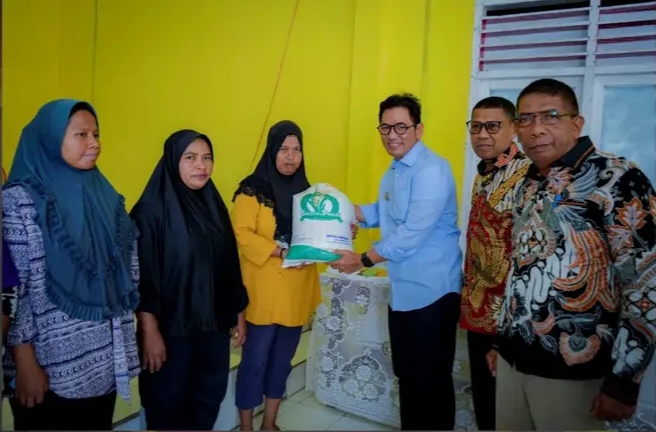 Pj Bupati Buton Tengah, Andi Muhammad Yusuf, saat membagikan bantuan beras secara simbolis.