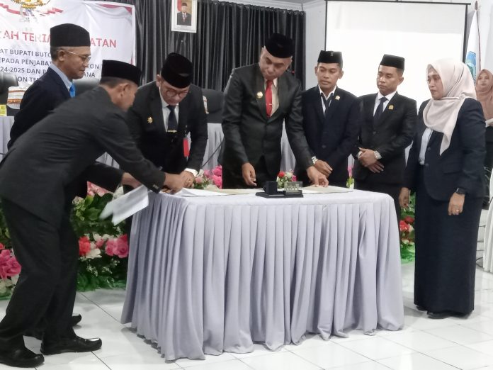 Pj Bupati Buteng 2023-2024 Dr.Drs.H Andi Muhammad Yusuf, M.Si bersama Pj Bupati Buteng 2024-2025 H. Kostantinus Bukide, SH.M.Si menandatangani berita acara serah terima jabatan pada rapat paripurna DPRD Buteng
