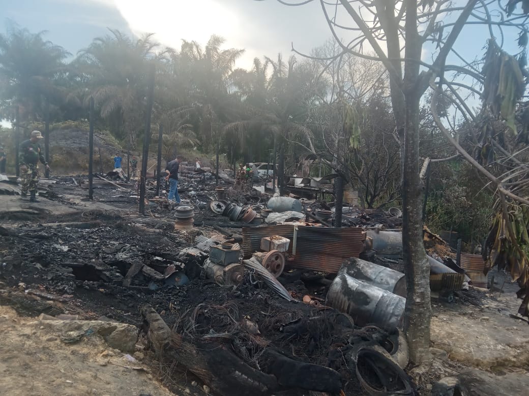 Tampak sisa puing bangunan rumah dan bengkel yang hangus terbakar di Desa Tepian, Kecamatan Bengalon, Kabupaten Kutai Timur, Kaltim. Minggu (08/10/2023).