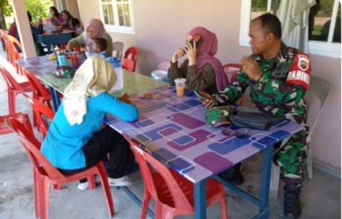Babinsa Koramil 08/Pulau Laut, Serda Zulkarnaini, saat menjalin komsos dengan warga Desa Tanjung Pala, Senin (02/09/2024) siang.