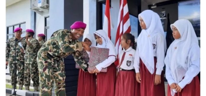 Satgas Komposit Marinir saat menyerahkan bantuan Beasiswa kepada Siswa-siswi SDN 005 Teluk Depeh, Desa Cemaga Selatan.
