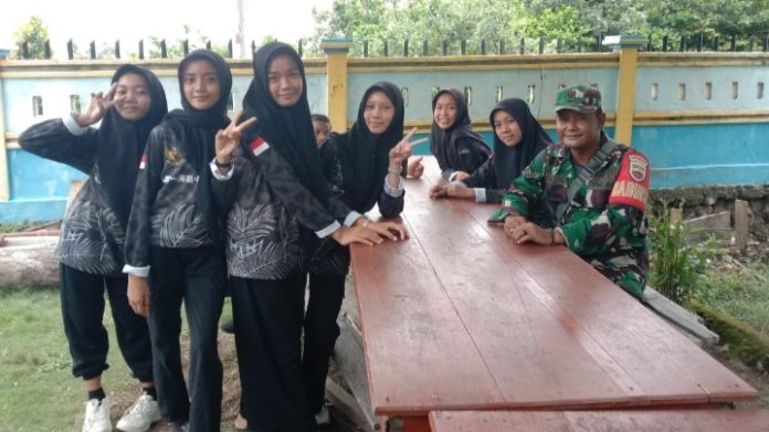Terlihat Babinsa Koramil 08/Pulau Laut Kodim 0318/Natuna, Serda Zulkarnaini, saat menjalin komsos dengan para pelajar SMP Negeri 1 Pulau Laut, Jum’at (18/10/2024) pagi.