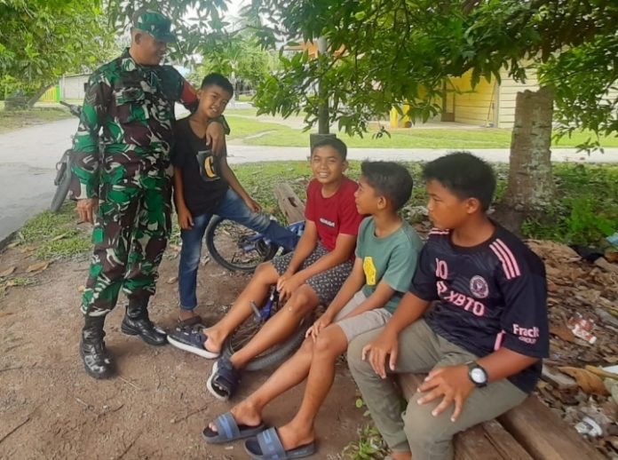 Babinsa Koramil 08/Pulau Laut, Sertu Sedarta Sembiring, saat melaksanakan komsos dengan anak-anak di Desa Air Payang, Minggu (03/03/2024) siang.