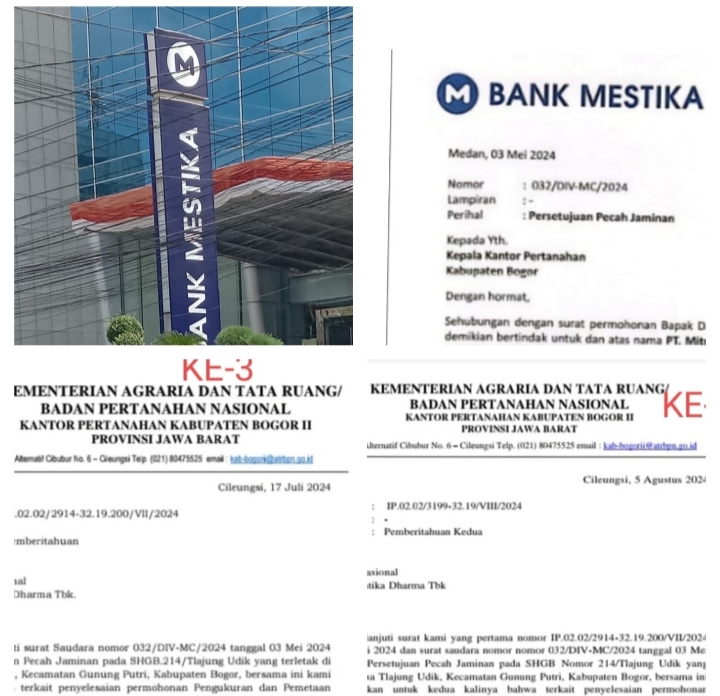Karena belum juga ada jawaban secara tertulis dari pihak Bank Mestika kepada BPN yang telah dipercayakan oleh pihak PT. Mitra, sekali lagi BPN Kab. Bogor menyurati PT. Bank Mestika melalui Surat Nomor: IP.02.02/3199-32 19/VIII/2024, Perihal: Pemberitahuan Kedua pada tanggal 5 Agustus 2024 yang ditandatangani oleh Kepala Kantor Pertanahan Kabupaten Bogor II Atas Nama : Uunk Din Parunggi S.SiT, M.A.P.