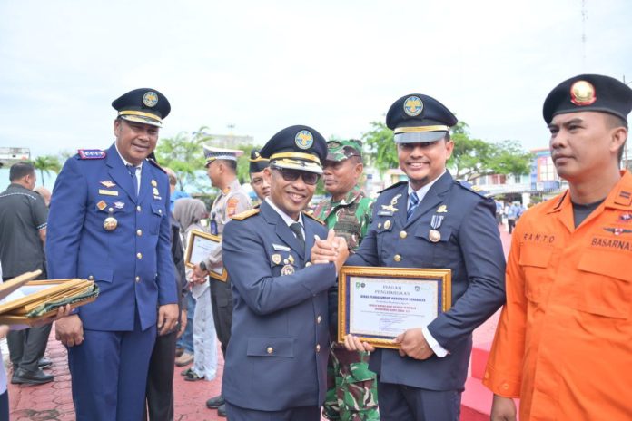 Wabup Dr. H. Bagus Santoso, Saat Menyerahkan Penghargaan Bakti Transportasi Untuk Negeri Kepada KSOP Kelas III Bengkalis.