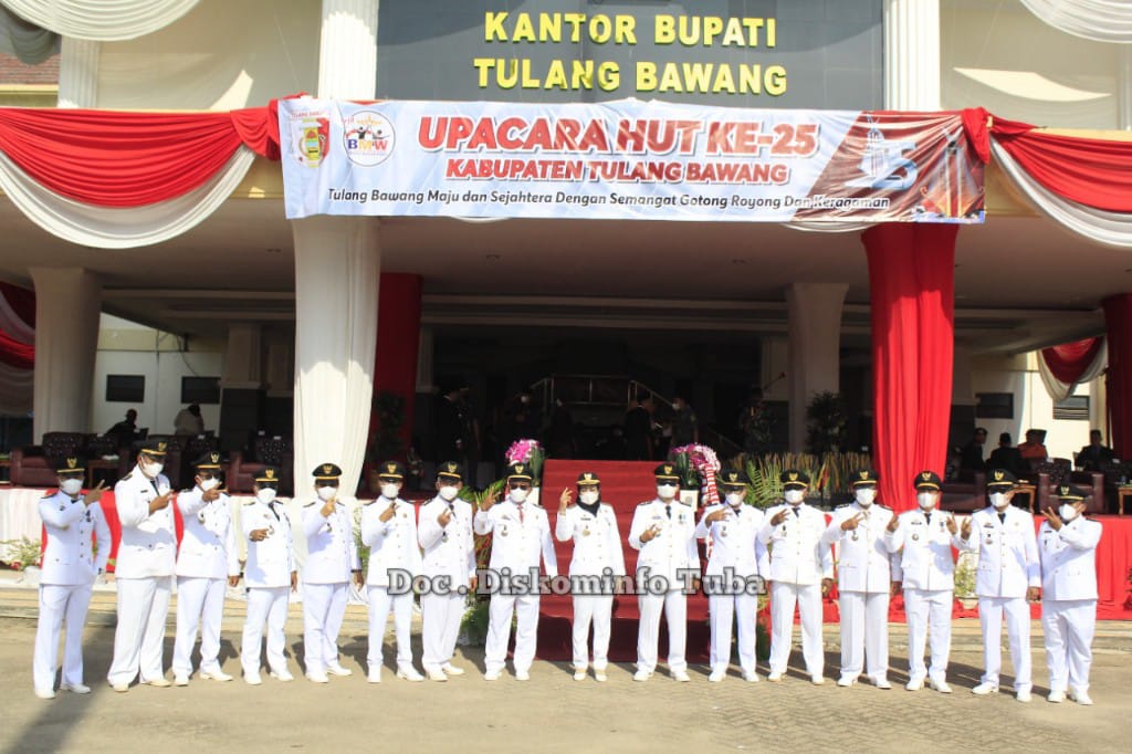 Upacara peringatan Hari Ulang Tahun Kabupaten Tulang Bawang yang Ke-25 kali ini dilaksanakan dengan Prokes Covid-19 yang sangat ketat karena mengingat adanya pirus Covid-19 yang saat ini belum benar-benar musnah demi mencegah maka setiap kegiatan dilakukan Prokes Covid-19 yang ketat.