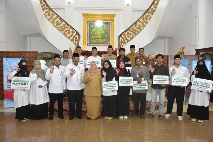Bantuan beasiswa diserahkan secara simbolis oleh Bupati Bengkalis, Kasmarni, didampingi oleh Ketua Baznas Bengkalis, Ismail, di Wisma Daerah Sri Mahkota, Senin, 22 September 2025.